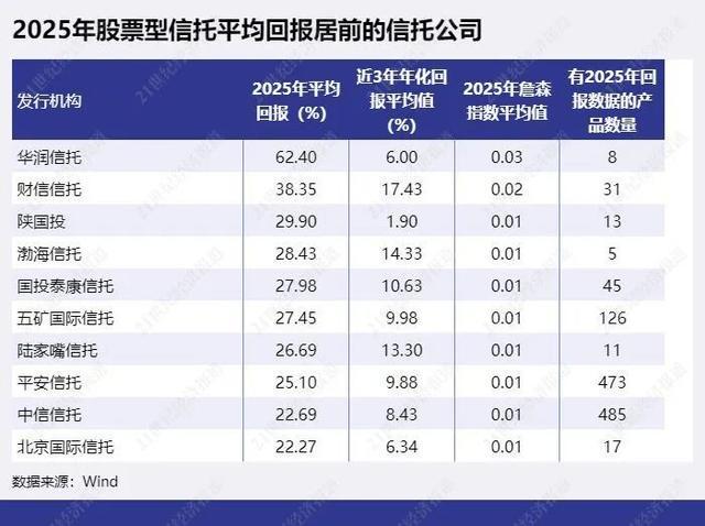 而2025年和近三年股票型信托收益表现均较佳的信托公司则包括财信信托、渤海信托、陆家嘴信托。