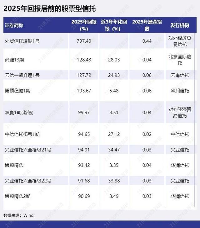 股票型信托2025年整体表现不错,有4只产品2025年收益翻倍,收益率最高的是“外贸信托璟琨1号”,2025年回报797.49%,不过该信托产品12月净值回撤幅度不小,12月回报为-27.5%。