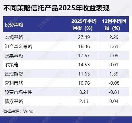 从不同策略的表现来看,2025年收益表现最佳的策略为宏观策略,采用宏观策略的信托产品2025年平均回报达27.49%。其次为组合基金策略,平均回报达18.36%,主要是FOF产品表现较佳,FOF产品2025年平均回报为18.38%。