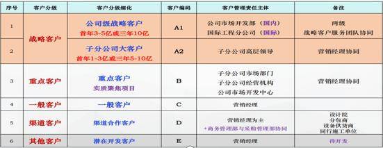 以中建等领先企业为对标标杆,建立清晰的客户分级标准与管理体系。将客户划分为战略客户( A1/A2类)、重点客户(B类)、一般客户(C类)、渠道客户(D类)、潜在客户(E类),明确不同层级客户的界定指标(如A1类公司级战略客户需满足首年合作3亿—5亿或三年 10亿)与管理责任主体。